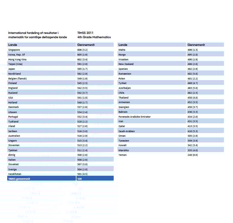 Kun otte lande – blandt andet Finland – klarer sig bedre end Danmark i matematik. Og det samme gør sig gældende for 4. klasses-elever i natur/teknik. Her ligger både Sverige og Finland over Dan-mark. Ti procent af de danske elever har en avanceret præstation i matematik og otte procent i natur/teknik. De tal er også højere end det internationale gennemsnit. Samtidig er der kun få danske elever i gruppen med dårlig præstation. Øverst i Timss-undersøgelsen (Trends in International Mathematics and Science Study) ligger lande som Singapore, Korea, Kina og Japan. Disse lande lå også øverst i 1995. Mere end 60 lande har deltaget i undersøgelsen de seneste år. Danmark har i 2011 udelukkende deltaget i undersøgelsen med 4. klasserne. 4000 elever i alt. I 1995 var de 13-årige også med i Timss-undersøgelsen, men af økonomiske årsager er det kun 4. klasserne nu. Tidligere betalte DPU, men Timss 2011 er gennemført med 50 procent støtte fra Ministeriet for Børn og Undervisning.