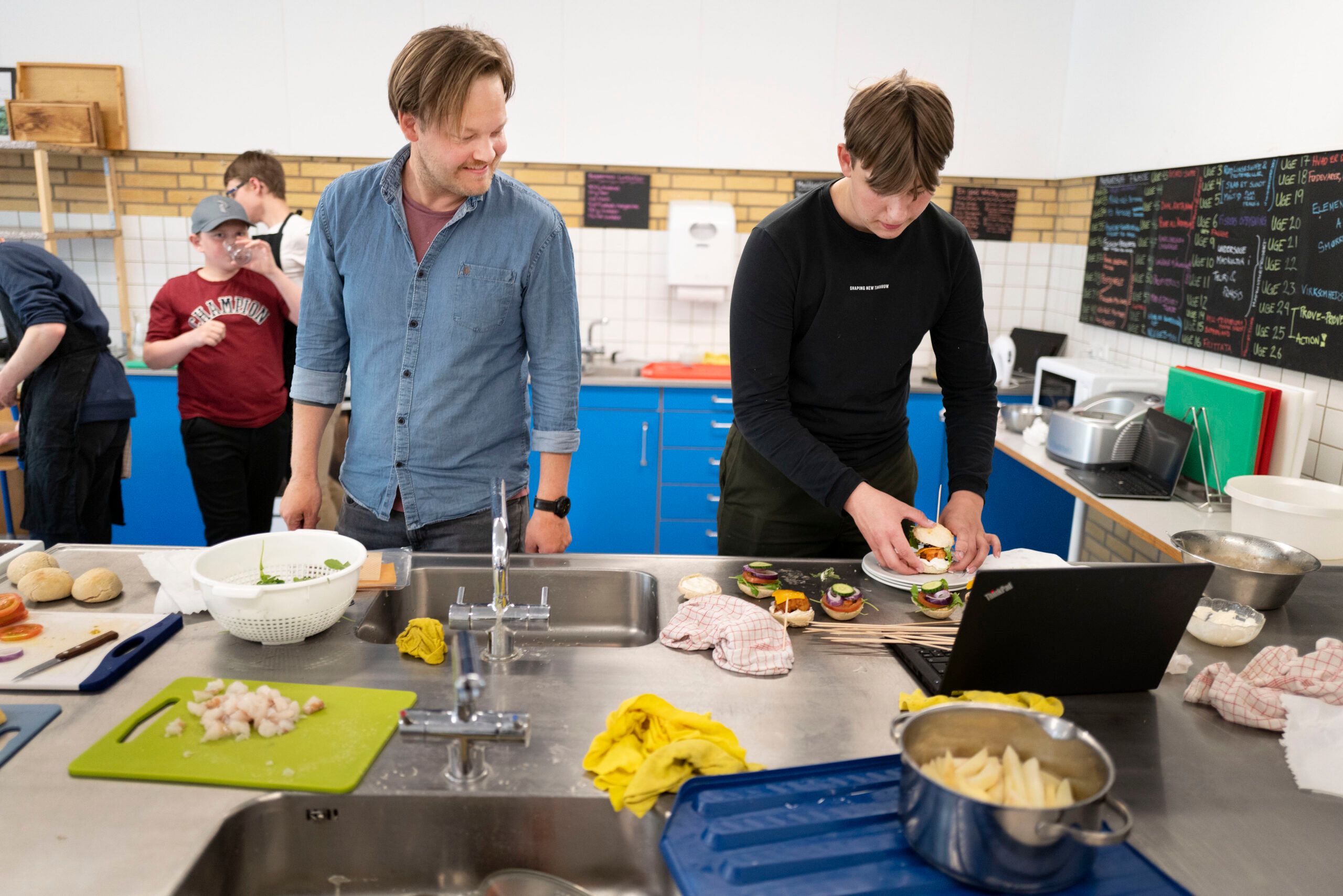 ”Ej, de er helt sorte! Hvorfor er der ingen, der har holdt øje med dem?” lyder det fra den anden ende af lokalet, da en ovnfuld minipizzaer viser sig at være blevet lidt gennembagte. På trods af usikkerheden blandt eleverne, ender flere og flere retter på udstillingsbordene, nogle af dem endda pyntet med basilikum, der i sidste øjeblik er blevet hentet i skolens køkkenhave. Så da gæsterne begynder at komme dryssende, er der masser af ting, de kan sætte tænderne i.