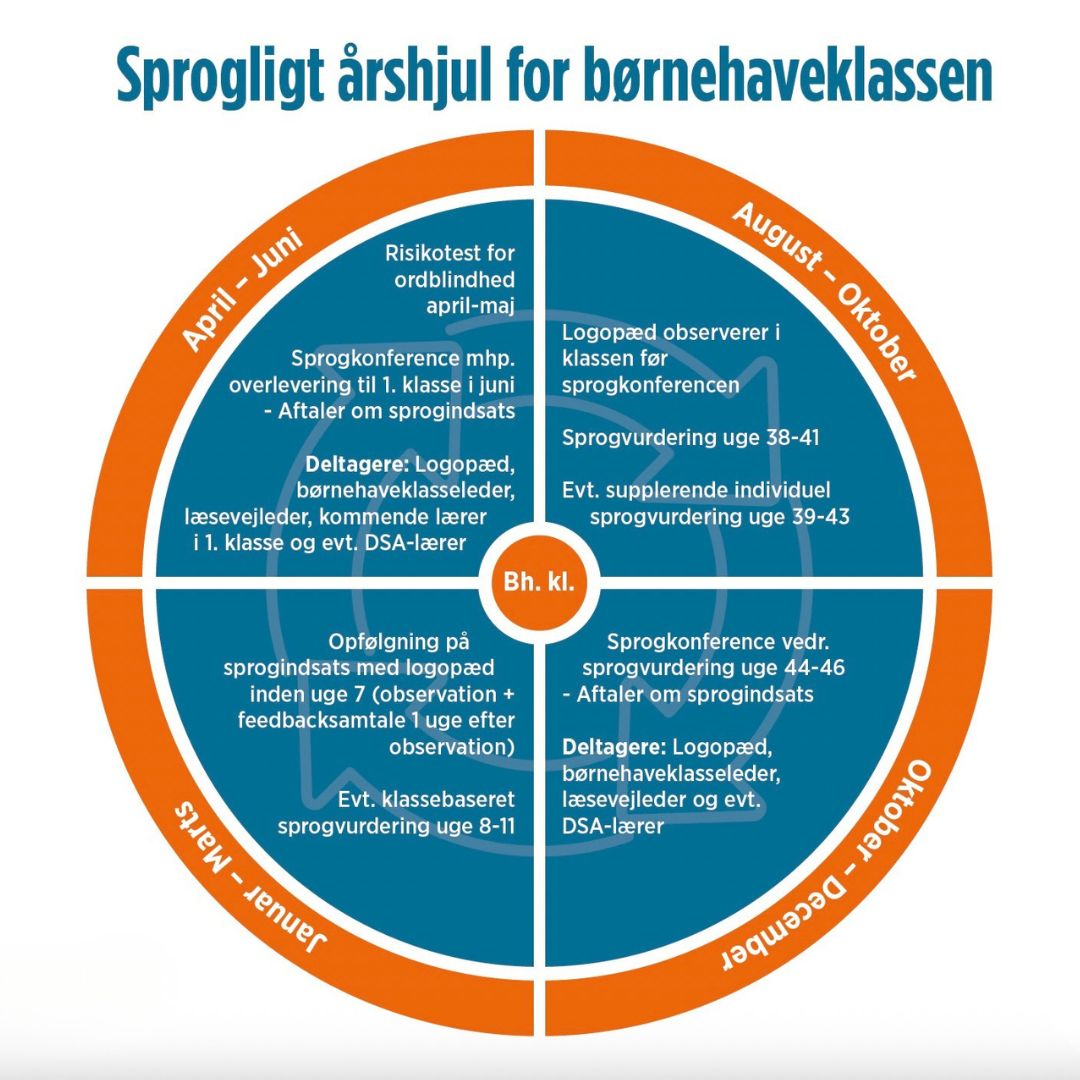 Helt konkret kører indsatsen efter et sprogligt årshjul delt op i fire kvartaler (se faktaboks). I to af kvartalerne får børnehaveklasserne besøg af en logopæd, som observerer klassen. Derudover afholdes der feedbacksamtaler og sprogkonferencer.