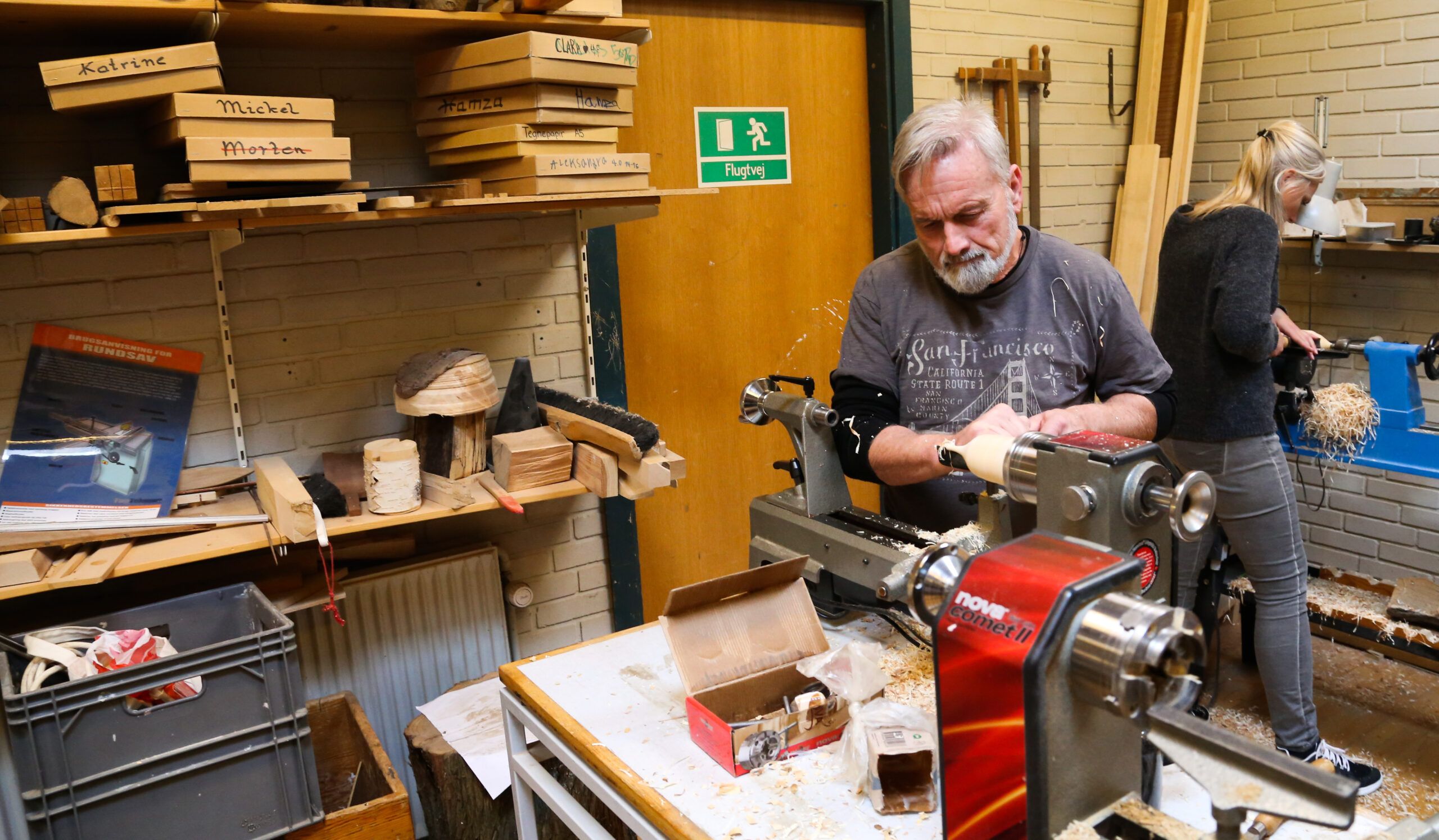 I træværkstedet er seks lærere gået i gang med at dreje. Bent Illum har sat dem på opgaven at lave en lille fugl med et løst hoved, der kan stilles til at være glad eller ked af det. Høvlspånerne fyger omkring Kjeld Hangaard fra Høng Skole, som prøver trædrejning for første gang. Han har undervist i mange år på en specialskole og er nu begyndt med håndværk og design på en folkeskole. Sammen med en anden sløjd- og en håndarbejdslærer har han 40 elever i to lokaler.