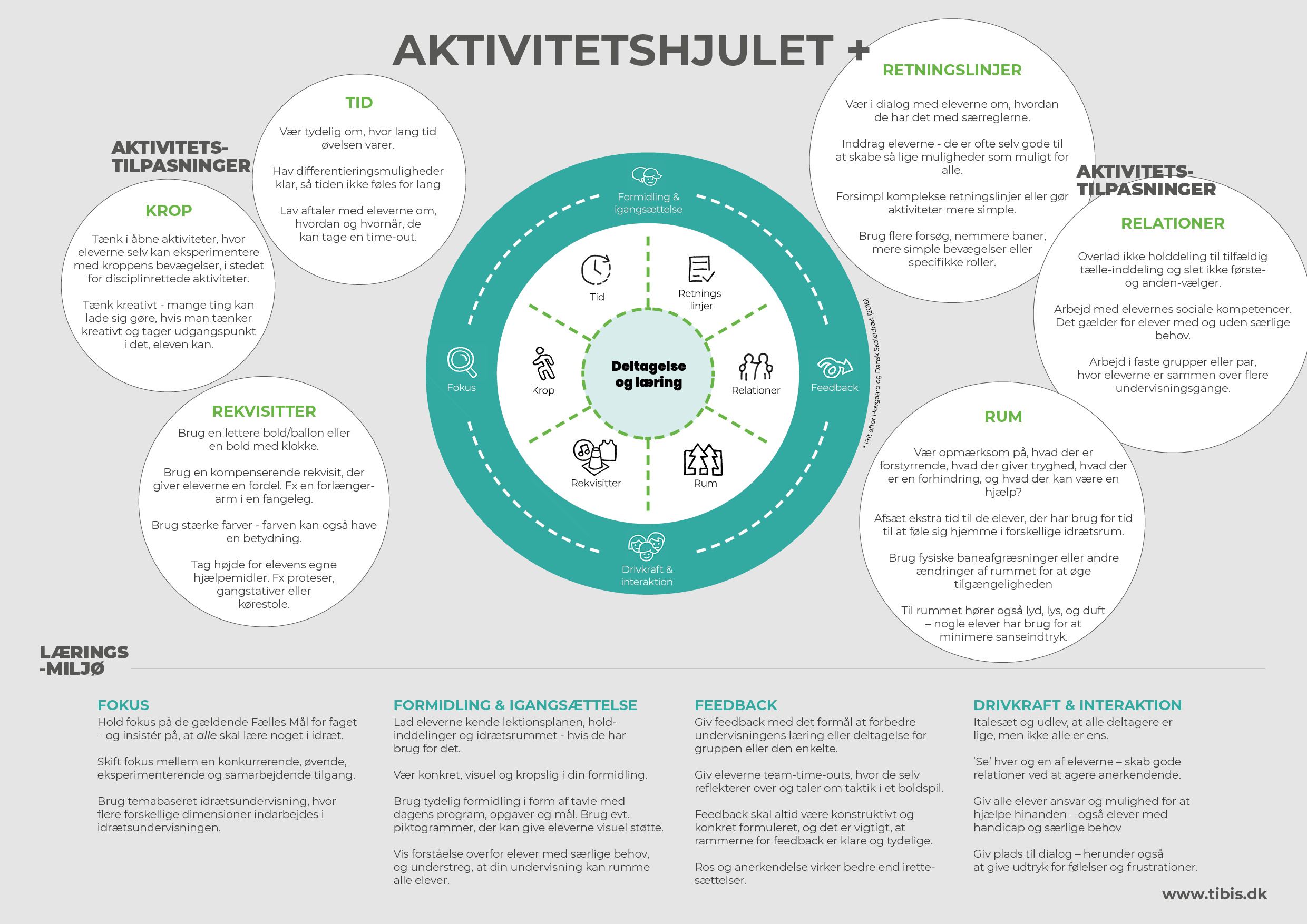 Alle idrætslærere kender Spilhjulet, og de fleste kender også Aktivitetshjulet (Hovgaard, 2017; Dansk Skoleidræt, 2016). På www.tibis.dk har vi beskrevet, hvordan Aktivitetshjulet kan bruges som værktøj til at inkludere elever med fysiske og psykiske handicap i idrætsundervisningen. Vi kalder det Aktivitetshjulet+. I det oprindelige Aktivitetshjul er Energi aktivitetens centrale omdrejningspunkt, men I den nye model er det elevernes Deltagelse og læring. Du kan downloade Aktivitetshjulet+ i en god opløsning her.