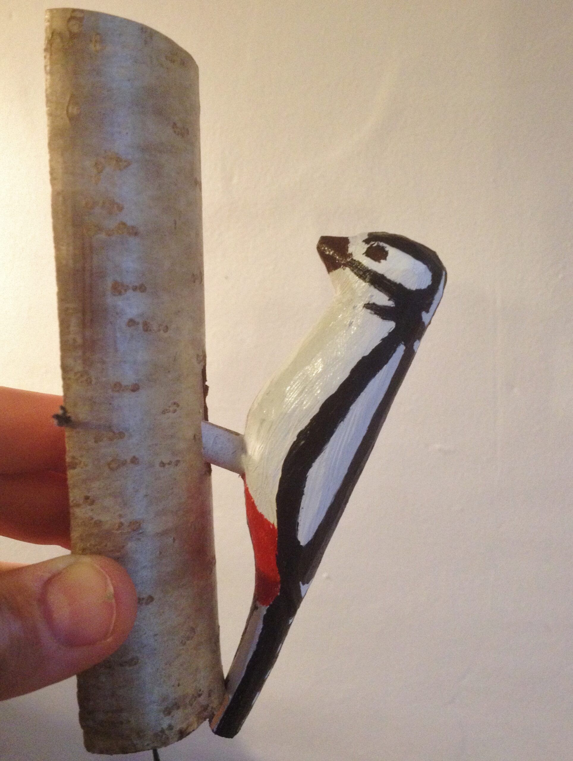 Et grenstykke halveres, og der bores to huller med en afstand på cirka 2cm. Mellemrummet snittes væk. På bagsiden snittes en rende til snoren. Spætten tilpasses i forhold til rundstokken, der bores hul i bunden af fuglen, og rundstokken sættes i. (Rundstokken må ikke være for lang, da fuglen så kommer til at flagre til siderne – på denne sidder den jo kun fast med ét søm). Der forbores i grenen ind til hullet og igennem rundstokken. Forneden på rundstokken bores et hul hvori snoren bindes fast. Justér før sømmet bankes helt igennem.