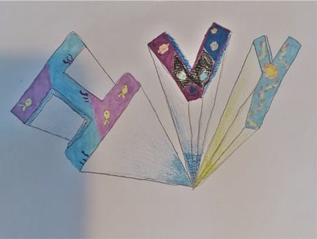 - Derefter farvelægges hvert bogstav med individuelle mønstre og detaljer. Her kan man stille krav til farver, stil og tema. Fx kan man bede eleverne vælge kun varme eller kun kolde farver. Man kan vælger organiske eller geometriske former eller noget helt andet.