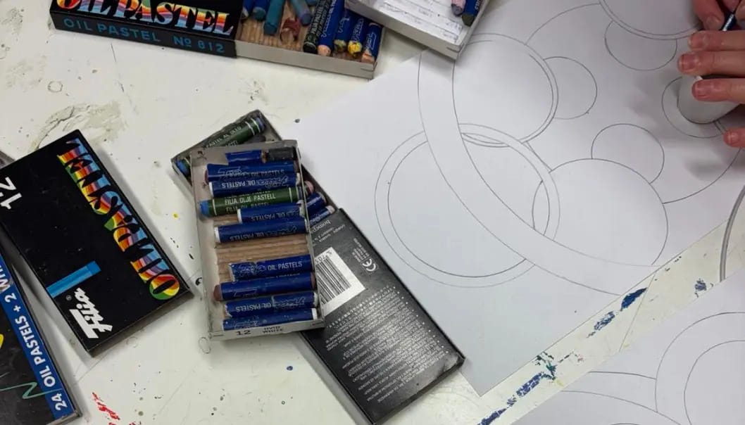 5. Oliepastelværker: En klassisk opgave og format er oliepastelværker, hvor eleverne laver hver deres cirkel-komposition med deres passer som redskab, eller ved at bruge runde ting og forme, som I finder på skolen. Bagefter kan farverne, der bruges, vælges med afsæt i teorien om simultankontraster.