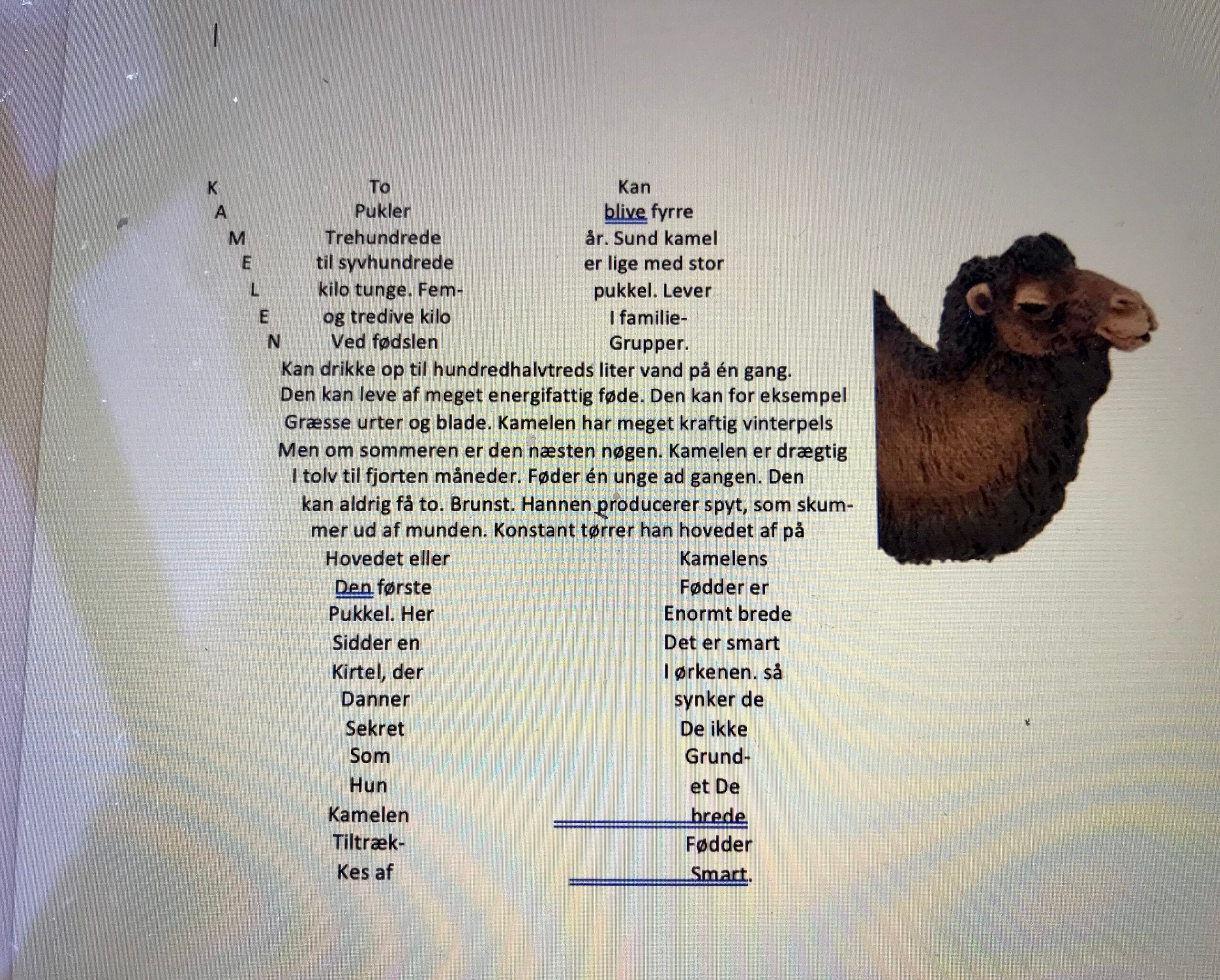 Kamelen her er et eksempel på, hvordan man som elev (her er det lærerstuderende, men de havde også en fest med opgaven) kan give faktaoplysninger et poetisk touch, samtidig med at man arbejder med sprog og formsprog. Karen Filskov gør det fremragende og professionelt, men det er en opgave, der kan åbne elevernes øjne for, at sproget har vidde og prægnans.