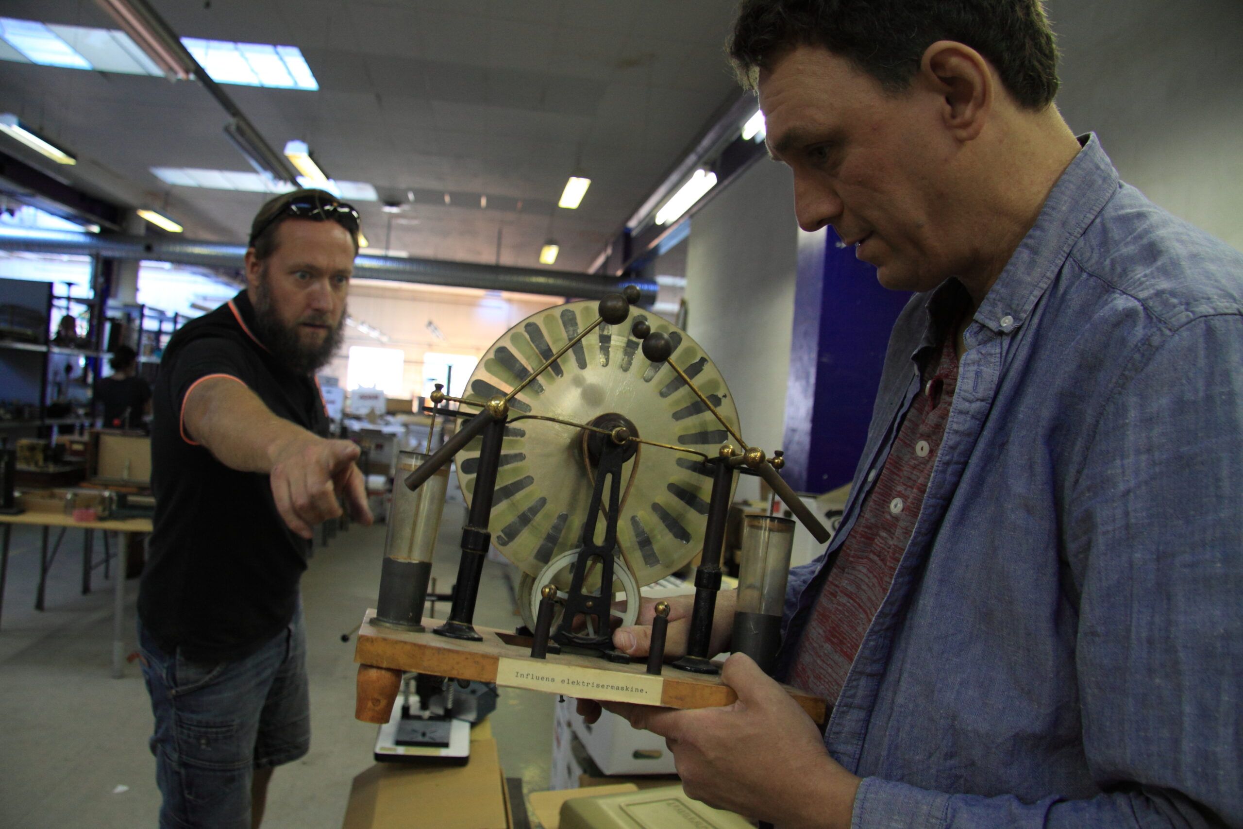 Da jeg træder ind i den afdeling af lagerhallen, der huser fysiksamlingen, bliver jeg mødt af et vidunderligt syn: fysiklærere i alle aldre står bøjet over flyttekasser, pakker alverdens redskaber ud, diskuterer med hinanden, sammenligner instrumenter eller lister omkring med næsen i de mange hylder med gamle håndlavede instrumenter. De ænser mig ikke, men styrer fokuseret rundt, scanner kasser, vurderer genstande og pakker kasser, som de skal have med tilbage til deres skole. Og det går stærkt, for det er først til mølle.