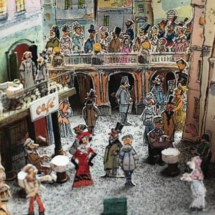 Hvor Nulle Øigaards billedtæpper opleves bedst på afstand, skal man have luppen frem for at få øje på Georg Metz' akkuratesser og finurligheder i de scenebilleder, som inden for en ramme af omkring 20 x 12 x 20 cm dels fastfryser den centrale scene i et skuespil eller i en opera, og dels tager os med backstage. Scenebillederne er blevet til i en kombination af lyst og formåen udi tegning samt en enorm viden om og kærlighed til teater og opera. Vi bliver ført frem til hvert dramas centrale scene og bliver på samme tid - og på humoristisk vis - gjort bekendt med det liv, der leves bag skuespillet.