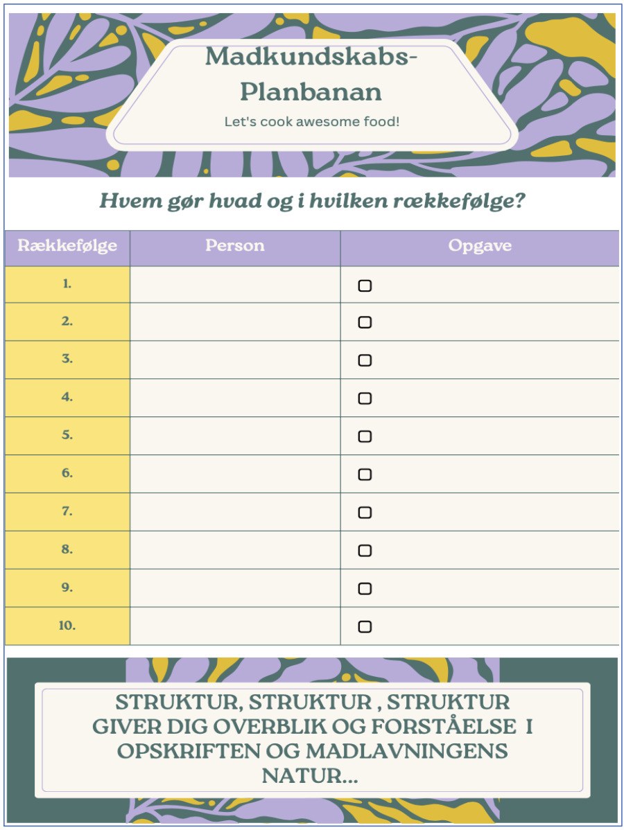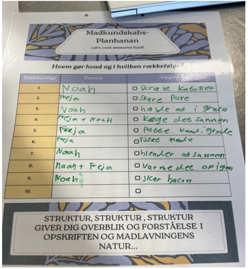 Strukturen er ved at være der i elevernes arbejdsprocesser i køkkenet. Når man overtager nye hold og elever, kommer de med forskellige ting, vaner, viden og tilgange til undervisningen i bagagen. Dette tænker jeg er ganske naturligt.