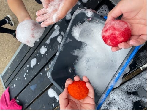 Senere vådfiltede de en ”pille dims” over en strandsten. Stenen blev pakket i karteflor og alle arbejdede med det lidt langsomme arbejde det er, at pakke bedst muligt og så fibrene har bedst mulige fat. De filtede kort ved hjælp af fugt og varme fra hænderne inden vi gik udenfor og filtede videre i lunt sæbevand.