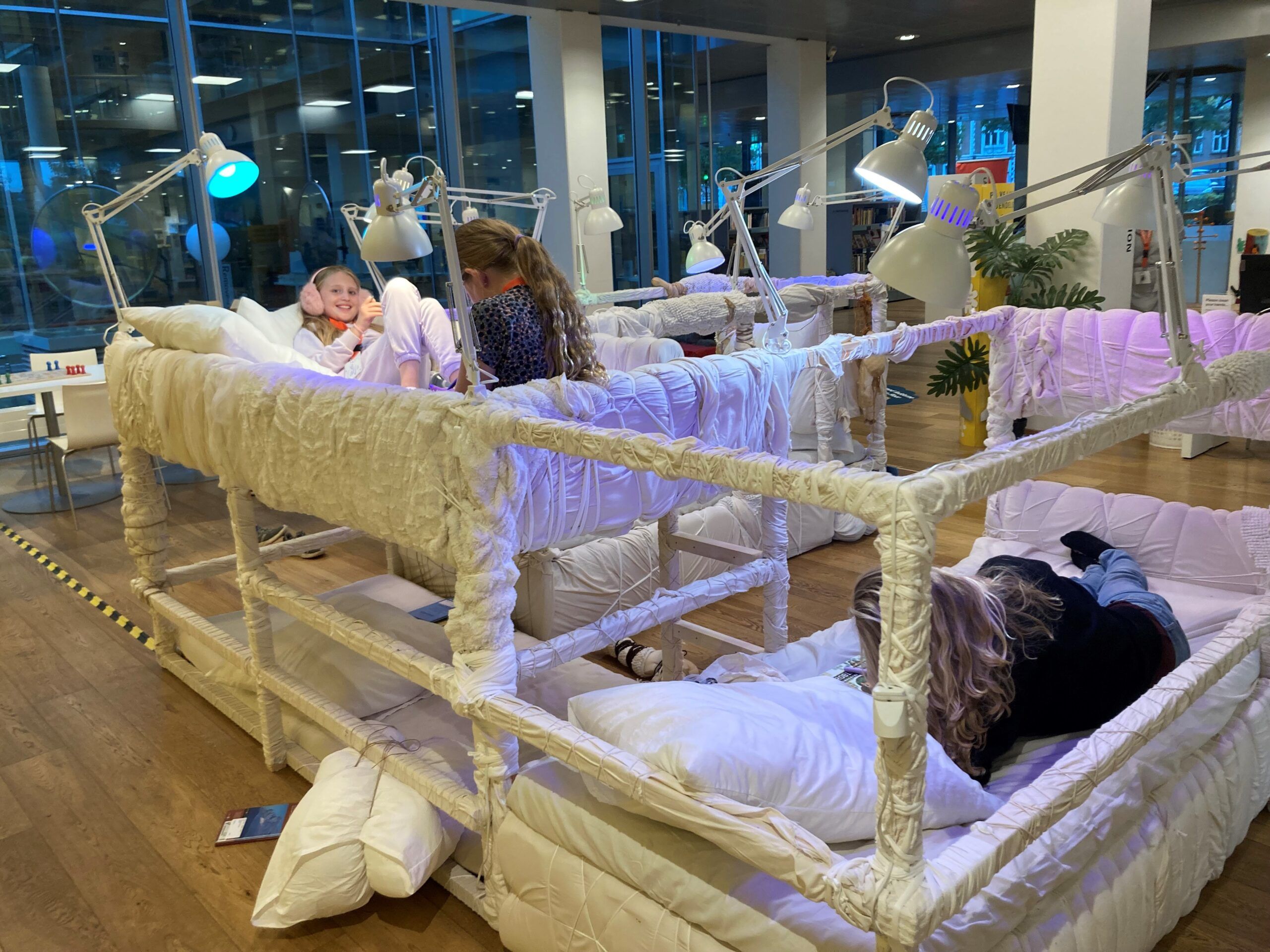 Det har været sjovt og inspirerede at observere brugen i de nu 4 måneder, vi har haft prototypen stående på børnebiblioteket. Der er ikke nogen tvivl om at ”Mere sammen, hver for sig” mest af alt er blevet brugt som et legeredskab, der har udfordret motorikken og sanserne. ”Mere sammen, hver for sig” har haft det hårdt som et legemøbel. Der er gået en del lamper og pærer til i de forgangne måneder og de hvide lagner er ikke længere helt så hvide, men heldigvis er det blot en prototype. Og det, som vi håbede på, har også været der: Læselysten. Blot mere plukvis og i højere grad foranlediget af voksne, der til deres børn har sagt ”Se, du kan tage en bog og ligge der og læse”. De voksnes betydning som rollemodel for deres børns lystlæsning kommer vi heller ikke helt uden om her – og til de, der ikke lige tror det, så kan der sagtens ligge en far med et barn på hver sin side og finde Holger. Vi glæder os meget til at se, hvad resultatet bliver af den testfase, som slutter om nogle få uger og hvordan særligt børnene har evalueret ”Mere sammen, hver for sig”. Det er jo ikke altid ens fornemmelser holder helt stik.