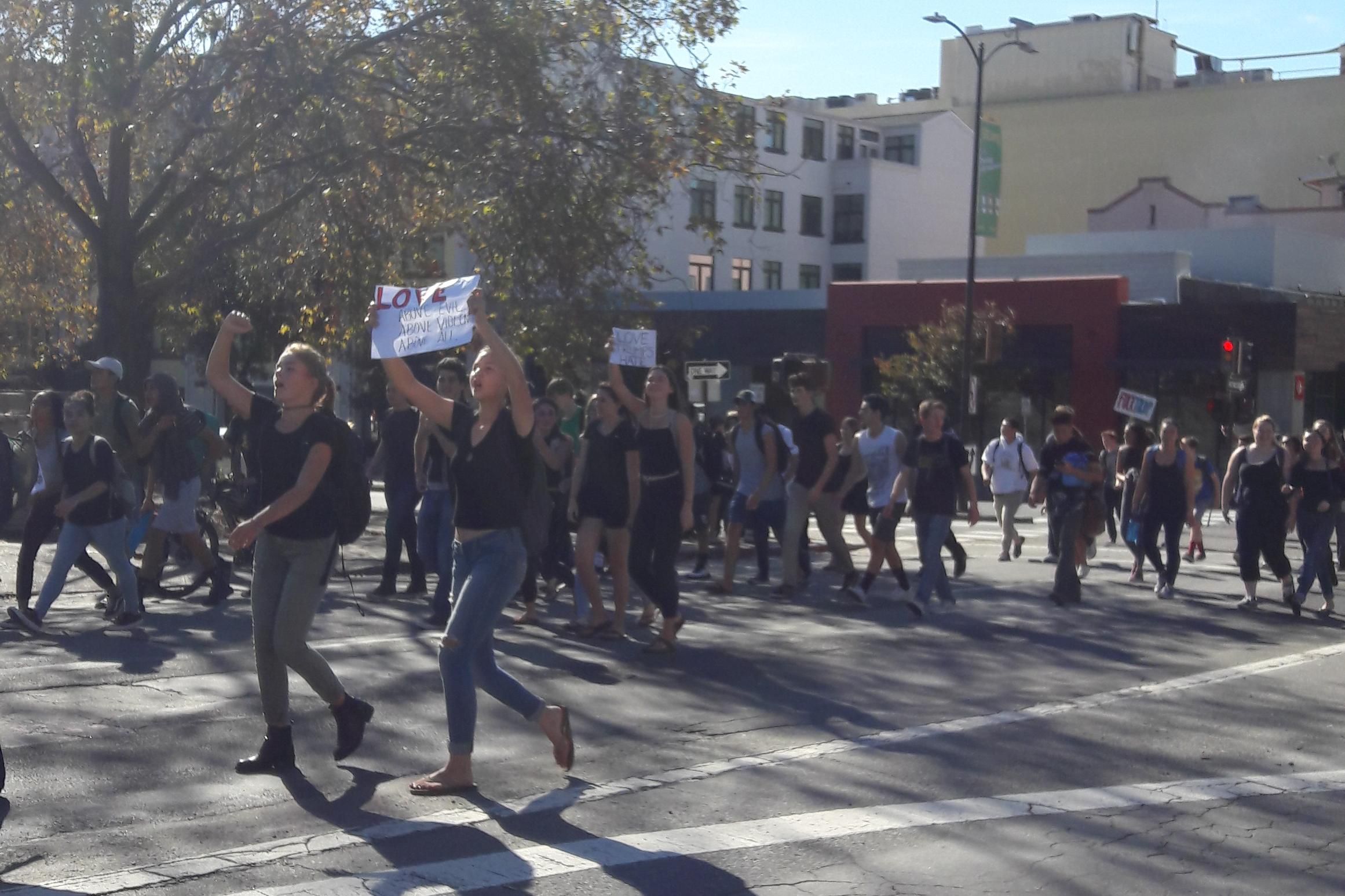 Skoleleverne synger og bærer plakater med smukke slagord om ”Love, not hate, not fear”, ”Love above evil, above violence, above all”, men også spejlinger af det de demonstrerer imod: ”Youth against Trump”. Min kone og jeg så dem gå fra Berkeley High til UC Berkeley-universitetet.