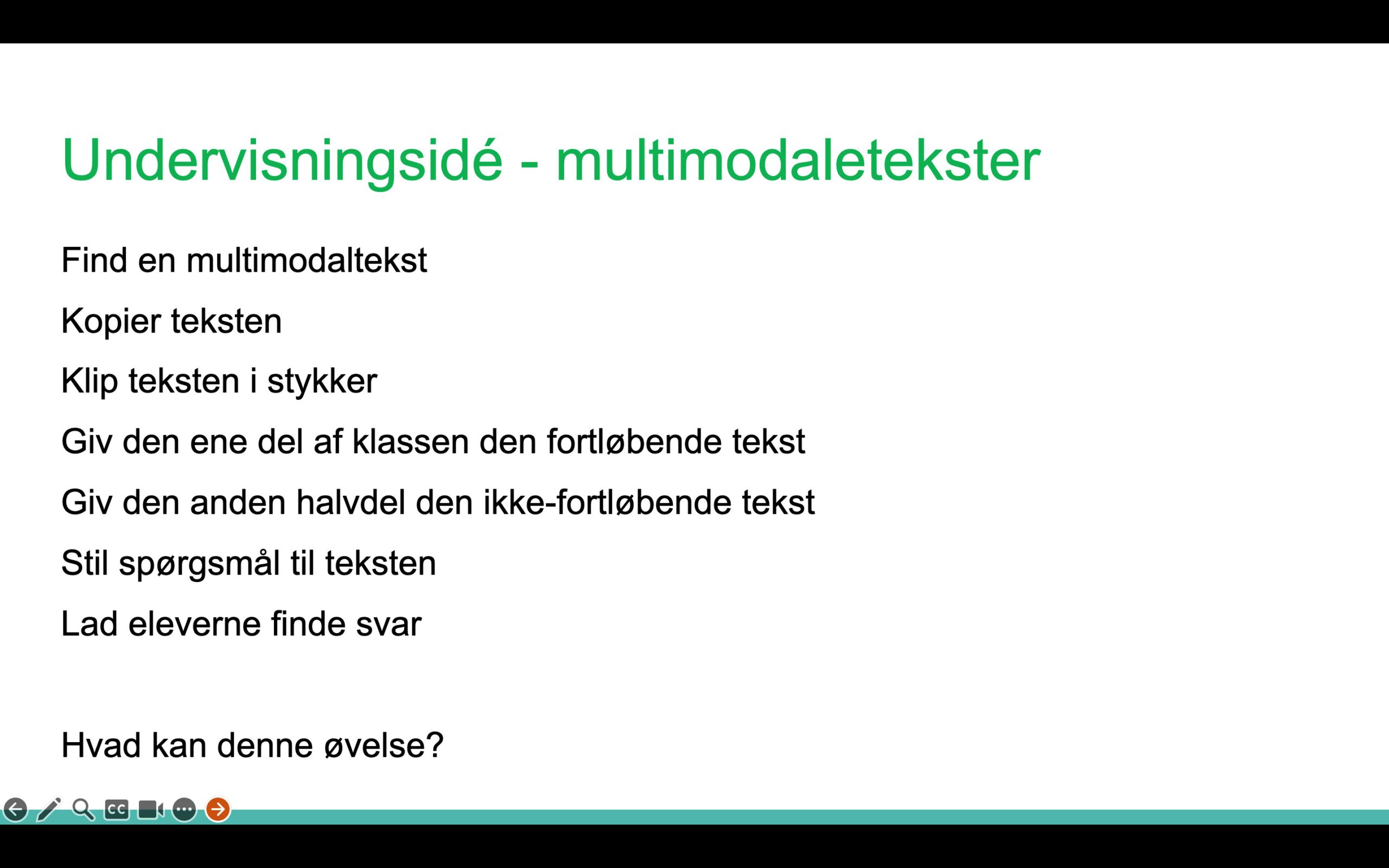 ”Multimodale tekster er tekster, hvis mening udtrykkes på forskellige måder, altså ikke kun gennem brødtekst, men også for eksempel billeder, grafer med videre. Tilsammen udgør tekst og billede en betydning, som er større end hver enkelt modalitet for sig. Det stiller særlige krav til fortolkningen af multimodale tekster, forklarer han.”