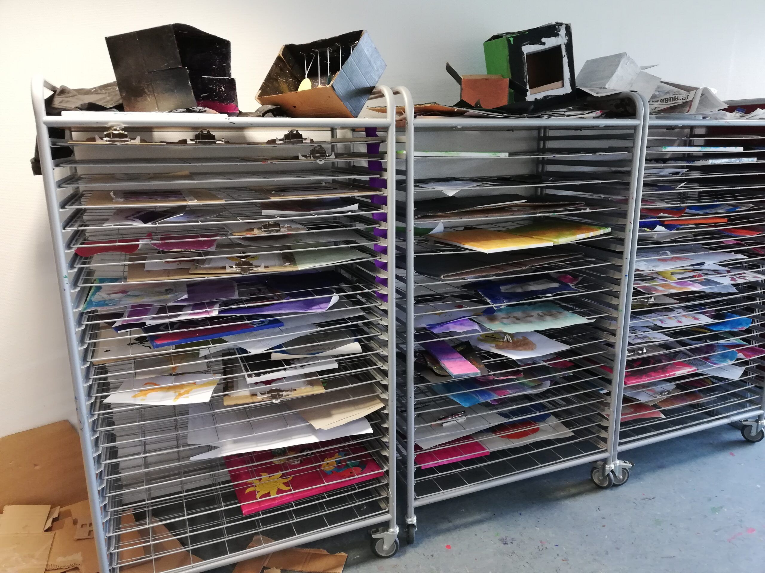 Lokalet rummer også et nyt metalskab, som indeholder kasser med A3 mapper, som igen indeholder elevernes igangværende projekter. Større projekter opbevares på større blå hylder.