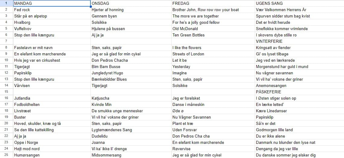 Man kan også kigge på bud andre steder fra, som f.eks. kollegaer fra andre skoler, eller ressourcer som dansksangdigital.dk, som har lavet en årsplan for i år, som kan downloades i Excel. Planen for sidste år ligger der også stadigvæk: