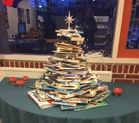 Vi laver hver år et juletræ af kasserede bøger. Træet bliver pyntet med både lys og stjerne og lyser dejligt op i julemåneden.