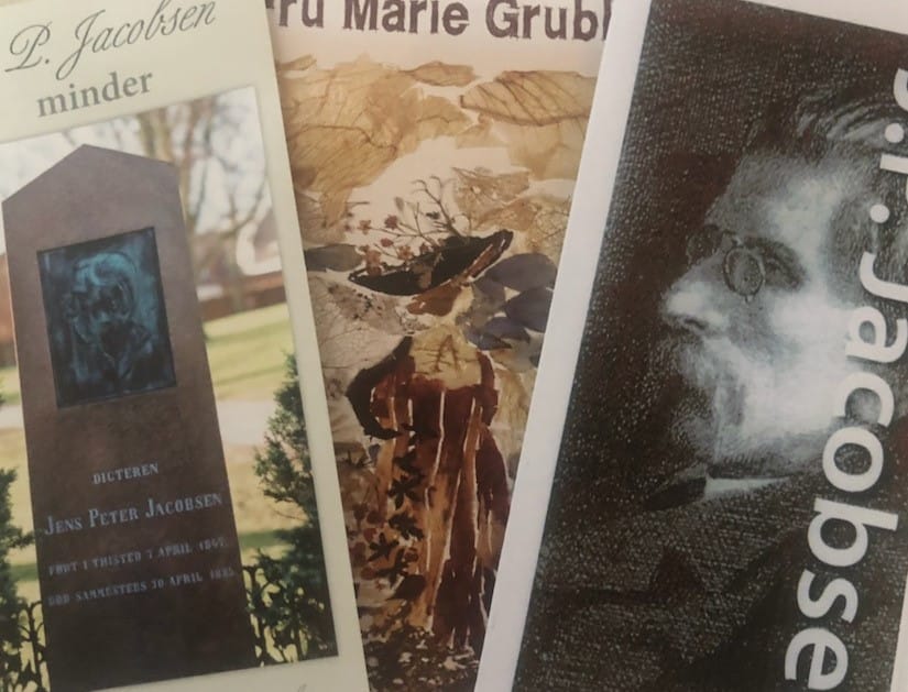 På J.P. Jacobsen-Selskabets bord ved Litterært Folkemøde ligger postkort og piecer, men mest iøjefaldende er en udgave af hans roman Fru Marie Grubbe med et særegent, florlet billede på omslaget.
