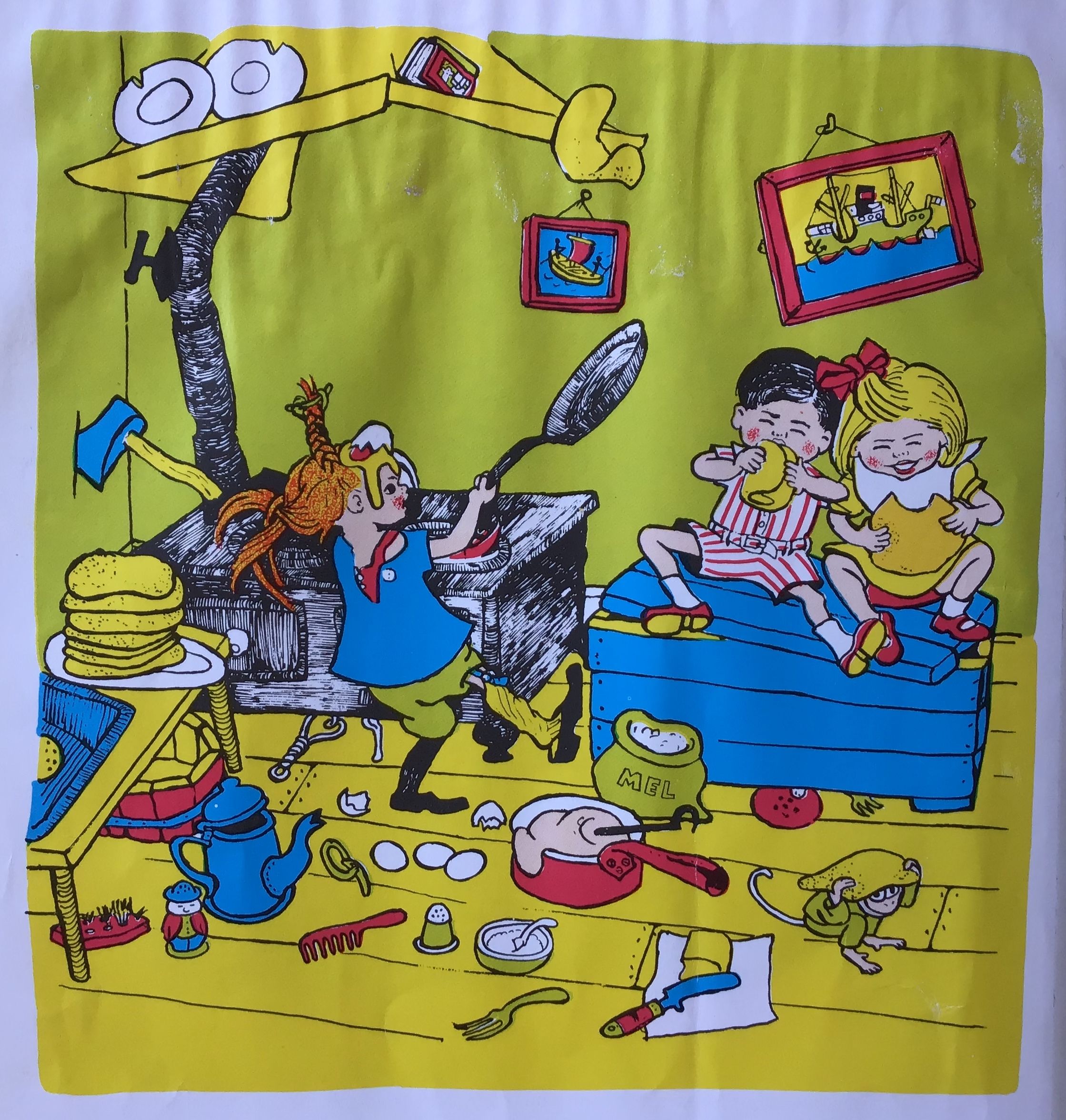 ”Kender du Pippi Langstrømpe” hedder en af billedbøgerne. Den er gul på forsiden, den er fra 1947, og her er Ingrid Nyman tegneren bag Pippi, Tommy, Annika, Blom og BalladeKarlsen og de andre figurer i Pippis verden.