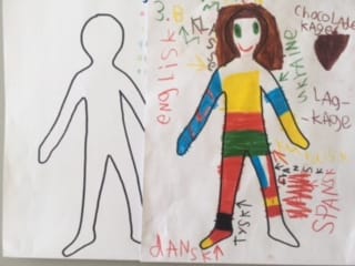 Og sikke en rigdom af sprog der blev fremtryllet på papiret – de sprog man kunne bedst, fyldte det meste af kroppen, men der blev også plads til sprog, hvor kendskabet blot var enkelte ord. Portrætterne og den efterfølgende samtale med klassen gav min kollega og jeg en helt særlig og vigtig indsigt i børnenes sproglige repertoire. En interessant opstart på forløbet, hvor sprog blev nøglen til en større forståelse for hver enkelts barns verden – sprogligt og kulturelt.