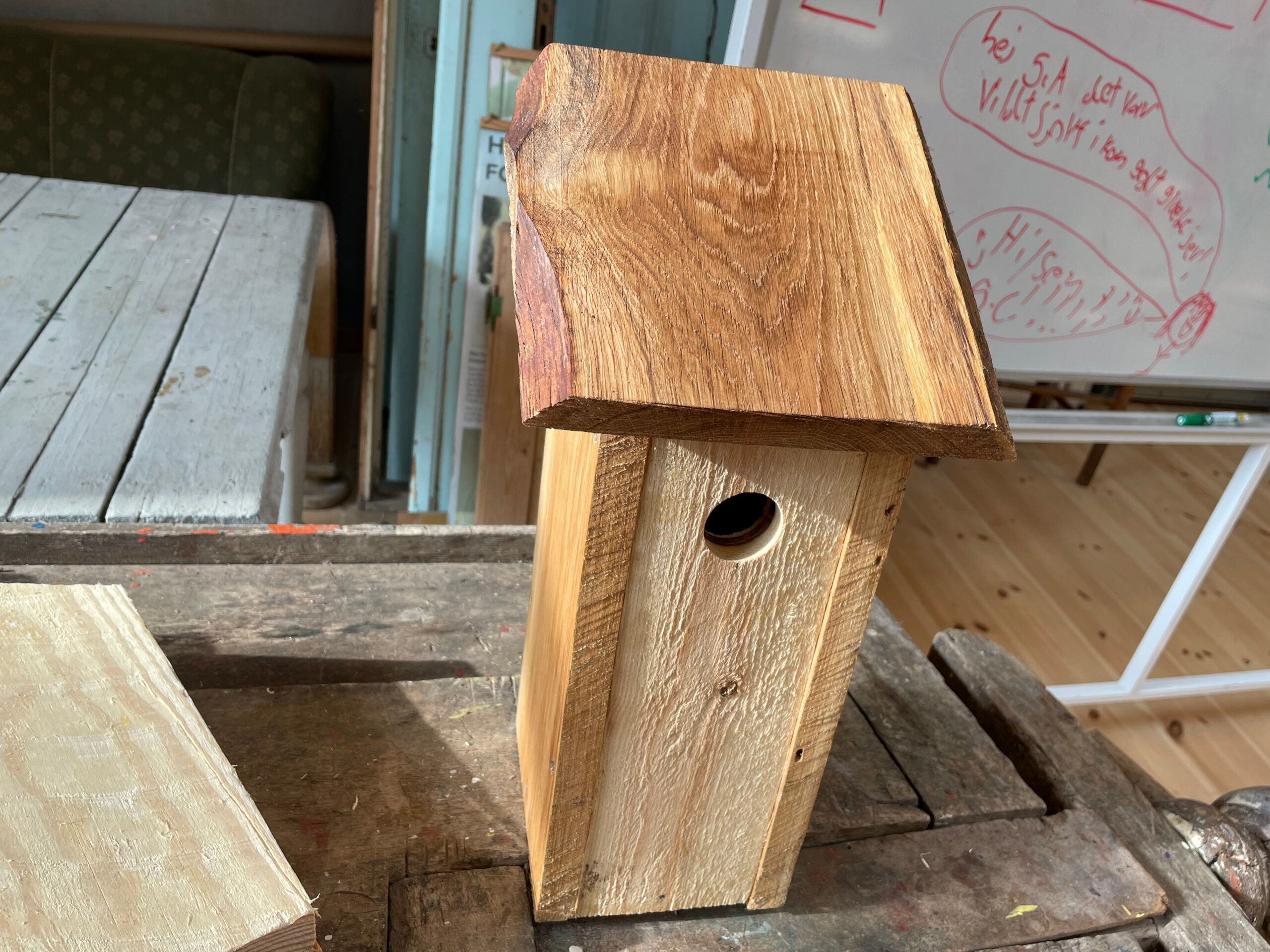 Vi har brugt rester fra de egetræsplanker, vi skar skærebrædder af i starten af skoleåret. Helge har gennemgået sine tegninger. Han har forklaret hvorfor det er vigtigt, at for og bagside er lavet i ikke høvlet fyr. Fuglene skal kunne kravle op ad siderne inde i kassen