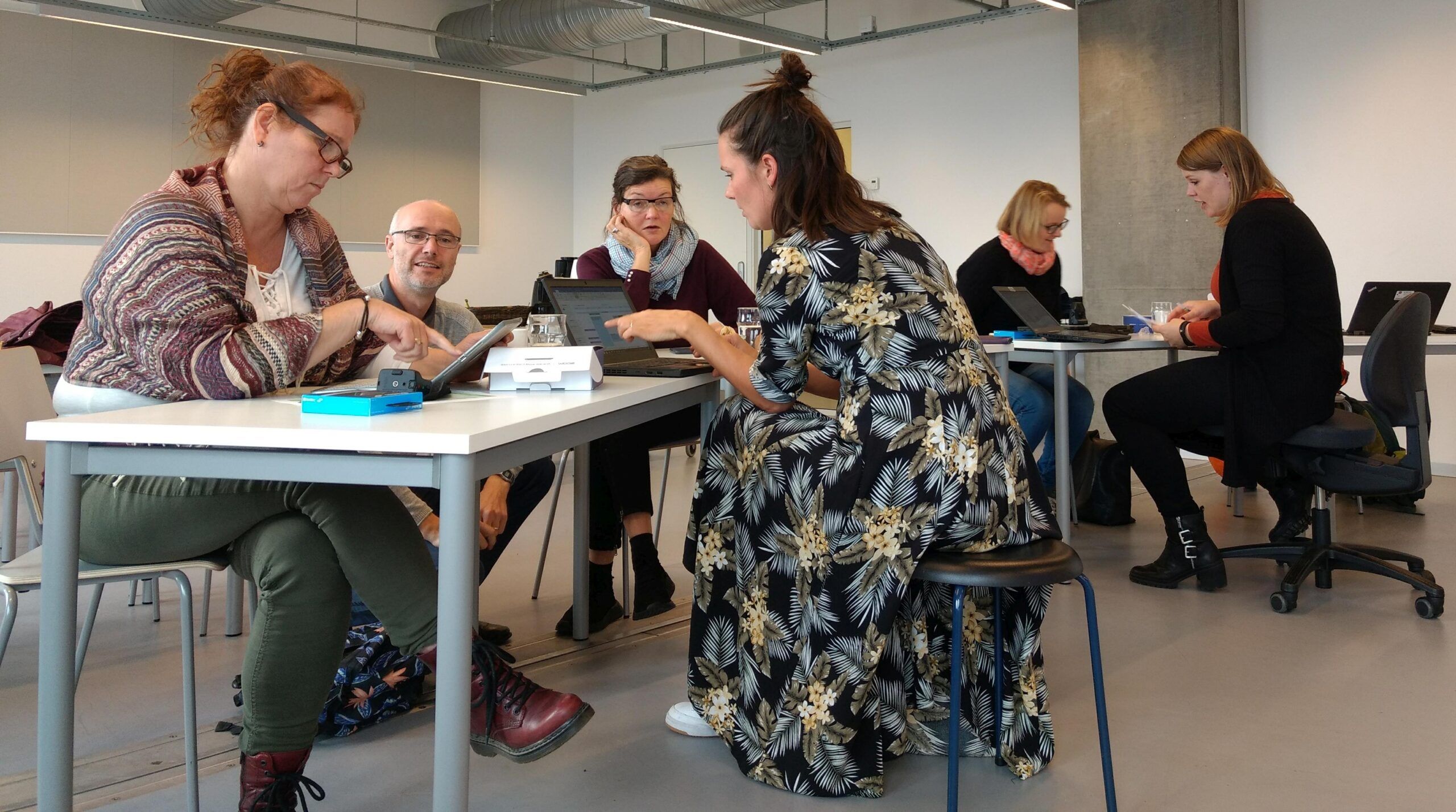 Billede: SeSam-CLASS workshop – videoudstyr afprøves og aftaler laves. (fra højre: Marianne Juul Jensen, Klaus Rasmussen, Birgitte Kargaard Lytken, Signe Malm, Mette Thaae Vest, Sidsel Katrine Petersen)