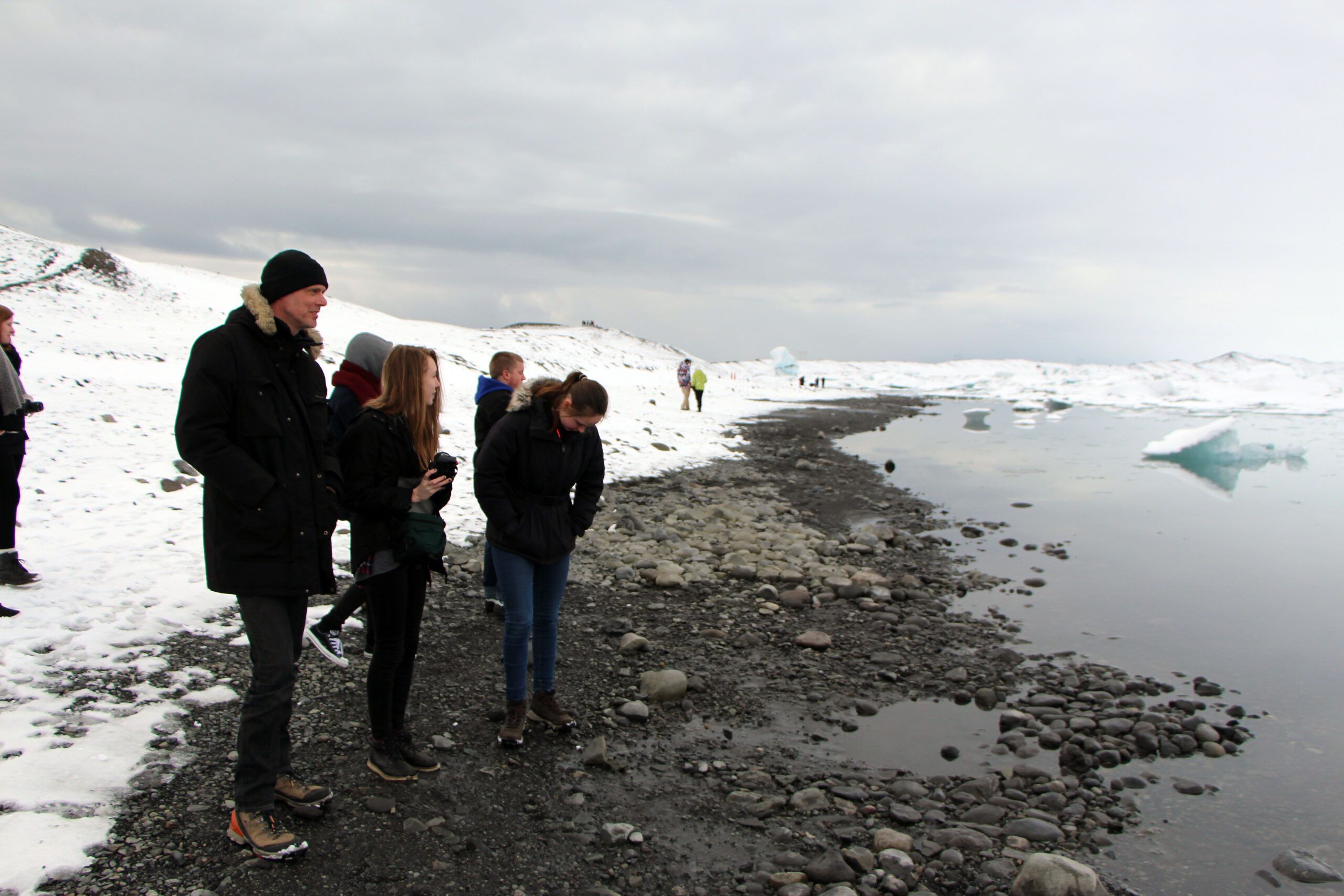 Derefter tog vi ud til gletsjerlagunen Jökullsárlon, hvor vi så et flot islandskab. Der var sne så langt øjet rakte, at det kunne minde om Grønland. Oppe fra randmorænerne på bredden, så vi i smeltevandsfloden mindre isbjerge og isstykker flyde ud mod havet. På nogle af de største stykker, langt ude, lå der søde, tykke sæler. Dog kunne vi kun observere dem i gennem en kikkert.Lige inden vi gik op for at spise vores frokost, hørte vi et kæmpe knas fra et isbjerg, der flippede en tur rundt i floden. Det så vildt ud, og den store bevægelse fik hele gletsjerlagunen til at skvulpe.