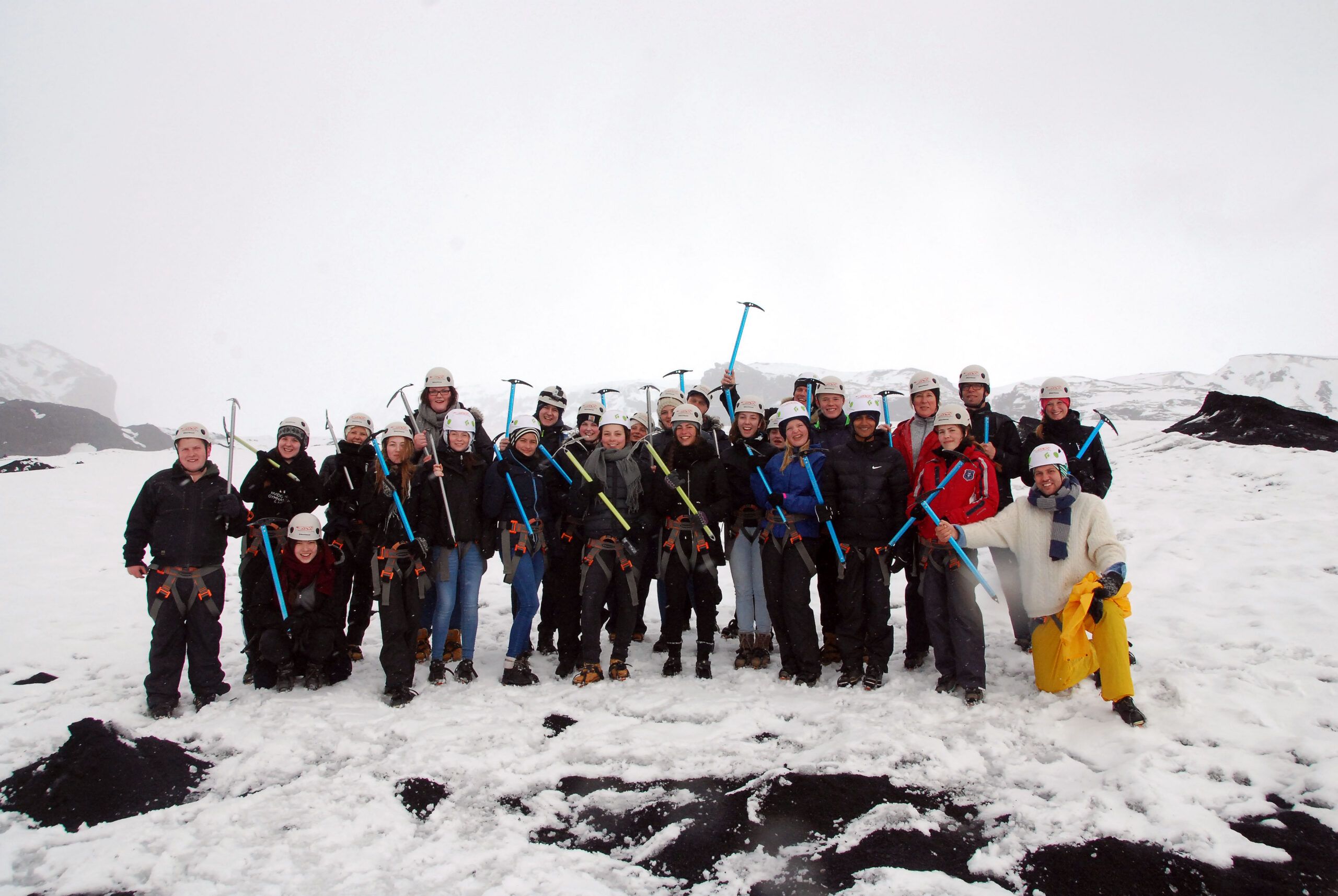 Nu begav vi os ud på isen, som mod al forventning var sort under den nyfaldne sne. Der ligger nemlig en masse aske og sedimenter ovenpå isen. Vi travede svedende rundt i en énmandskolonne og lignede Snehvides 26 små dværge. Vores guide fortalte undervejs sjove sagn, blandt andet om en bonde, der med sin baby overlevede et jøkelløb til søs. Et jøkelløb er en kæmpe bølge af smeltet is, som kommer ved et vulkanudbrud under en gletsjer. Efter tre timers vandring vendte vi atter næsen mod bussen, hvor vi udmattede faldt om i sæderne.
