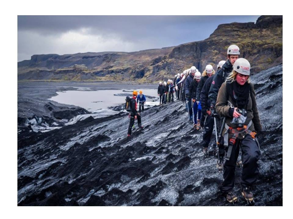 - Gletsjervandring på gletsjertungen Sólheimajökull (ca. kl. 13.00) – vi bliver guidet af professionelle folk og skal beskæftige os med glaciologi, glacialmorfologi (dødislandskaber) og klimaændringer.