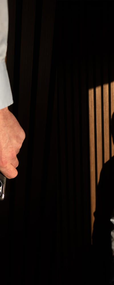Telefonen holder Paul Hansen diskret i hånden ned langs benet.