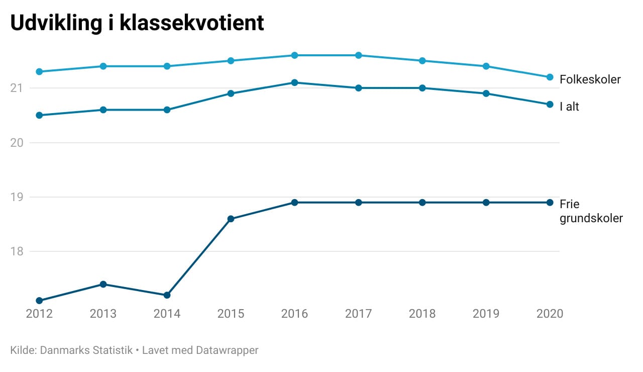 Der sad gennemsnitligt 21,6 elever per folkeskoleklasse i 2017, 21,5 i 2018, 21,4 i 2019, og i 2020 var kvotienten faldet til 21,2.