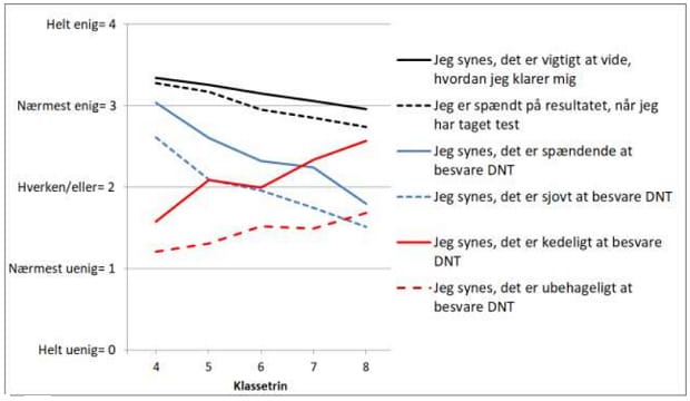 Igennem de godt 10 år, testene har eksisteret, har forskere, lærere og Danske Skoleelever berettet om, at især de alleryngste elever og de fagligt svage bliver bange og kede af det, når de skal tage nationale test. Men i NordicMetrics' survey er tendensen, at jo yngre eleverne er, jo mere positive er de over for de nationale test. Og det er på de skoler, der har det mest udfordrende elevgrundlag, at elevholdningen til testene er mest positiv.