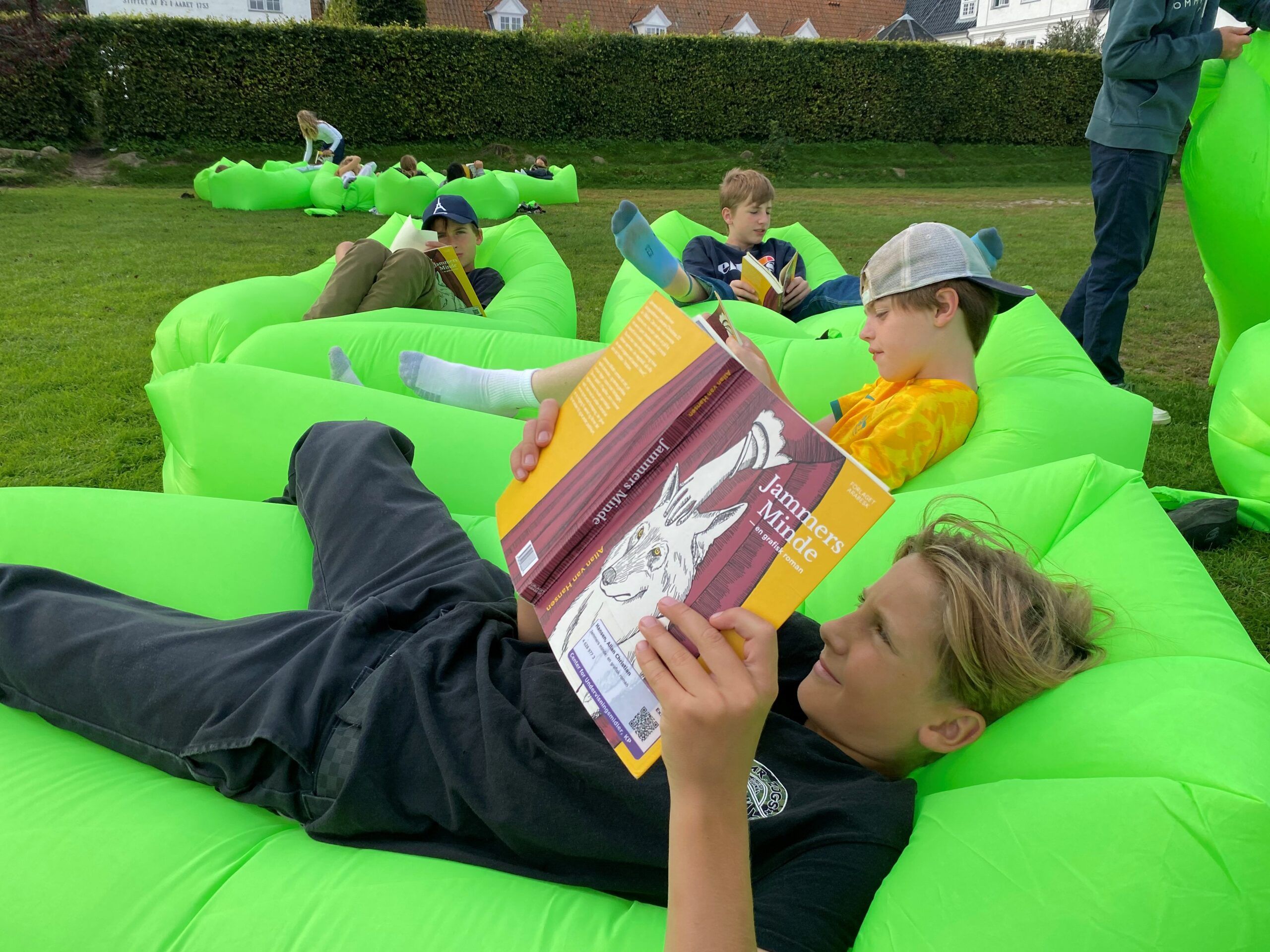 Senest har Trine Ferdinand sammensat en kasse med oppustelige læselystsofaer, så dansklærerne kan prøve at ændre læsemiljøet og tage læsningen med udendørs.