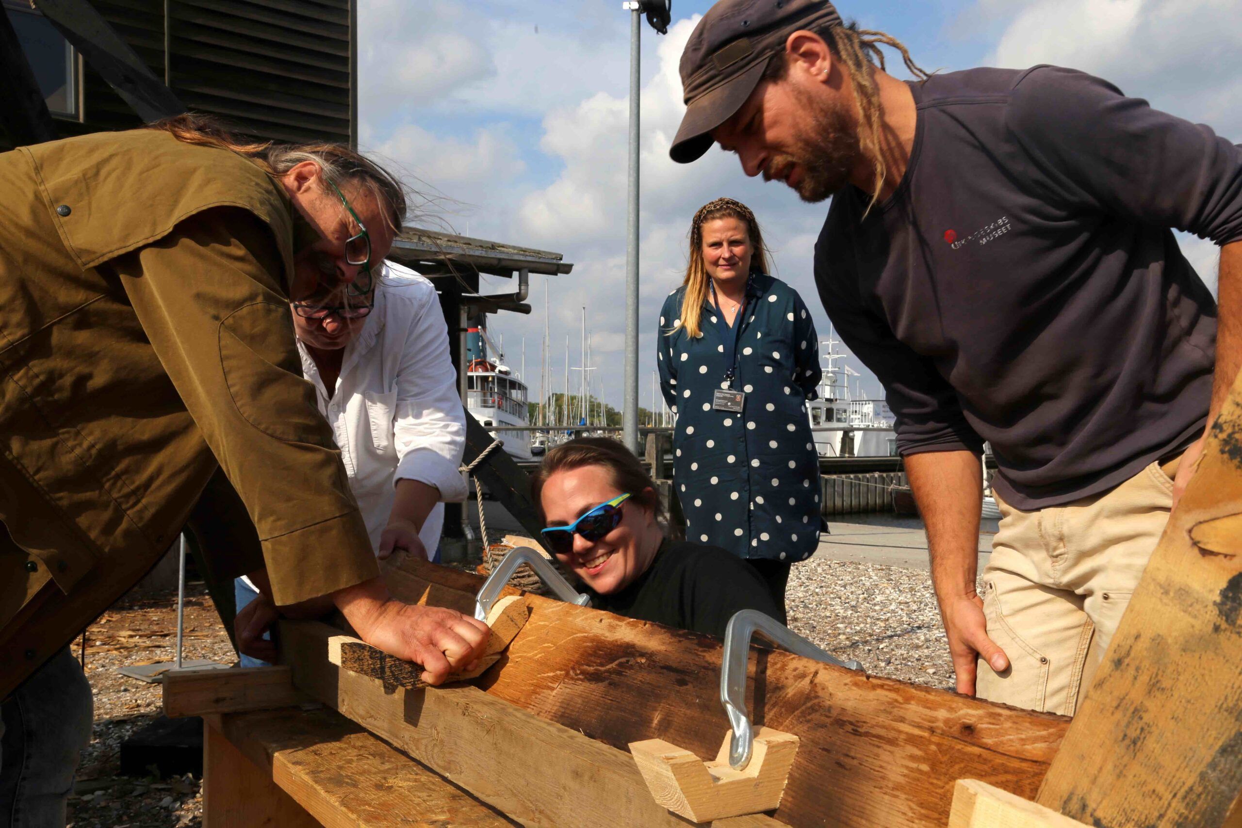 Efter morgenens diskussioner kommer lærerne ud i Vikingeskibsmuseets udendørs værksteder, og her er både mestring hos de superdygtige undervisere, som bygger bådene til dagligt. Men også fuld åbenhed om, at man har måttet lære undervejs i processen, når man prøver at efterligne oldgamle teknikker ud fra vrag. Lærerne får en god indføring i teknikkerne fra vikingetiden og bliver så sat i gang med at udvælge egeplanker og varme dem op i 45 minutter over lange bål for at kunne bøje dem til siderne af et skib.
