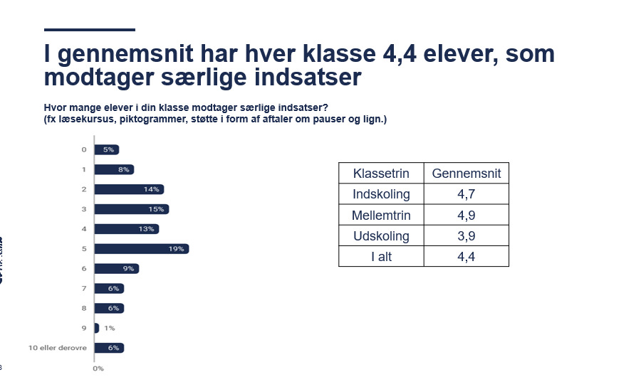 Undersøgelsen viser, at der i hver klasse sidder svarende til 4,4 elever, som modtager særlige indsatser. Flest på mellemtrinnet og færrest i udskolingen. I Line Slot Kristensens 5. og 6. klasse er der også nogle elever, der får en særlig indsats.