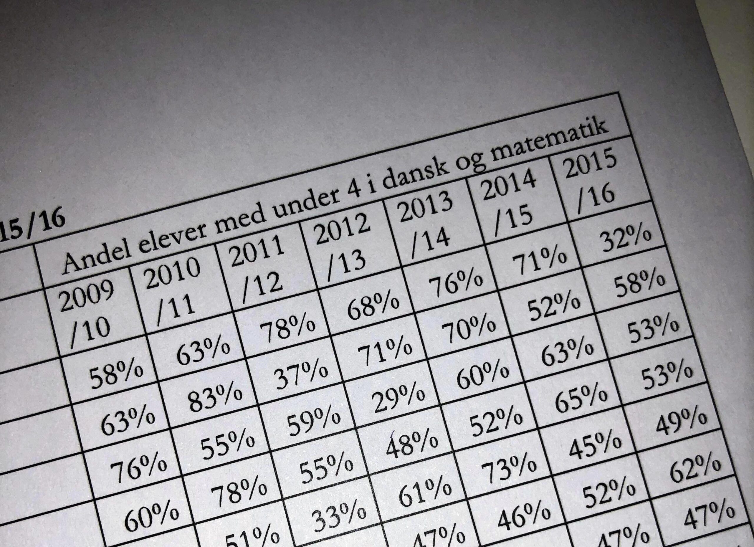 Folkeskolen kiggede sidste år på puljeskolernes resultater i dansk og matematik i perioden 2010-2016. Gennemgangen viste, at skolernes karakterer i gennemsnit har svinget med hele 24 procentpoint mellem det år, hvor skolerne har haft deres højeste andel af elever med under 4, og det år, hvor de havde den laveste andel.