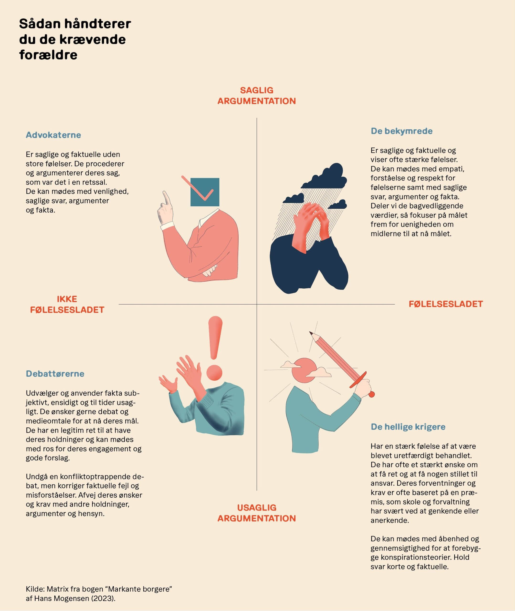 Hans Mogensen kategoriserer de markante forældre ud fra to parametre for at lave en form for arketyper. Det første parameter er, hvor store følelser forældrene bringer ind i en uenighed med skolen, og det andet parameter er, hvor sagligt de argumenterer for deres synspunkt. Ud fra de kriterier opdeler han markante borgere i fire kategorier, som han mener skal håndteres forskelligt.